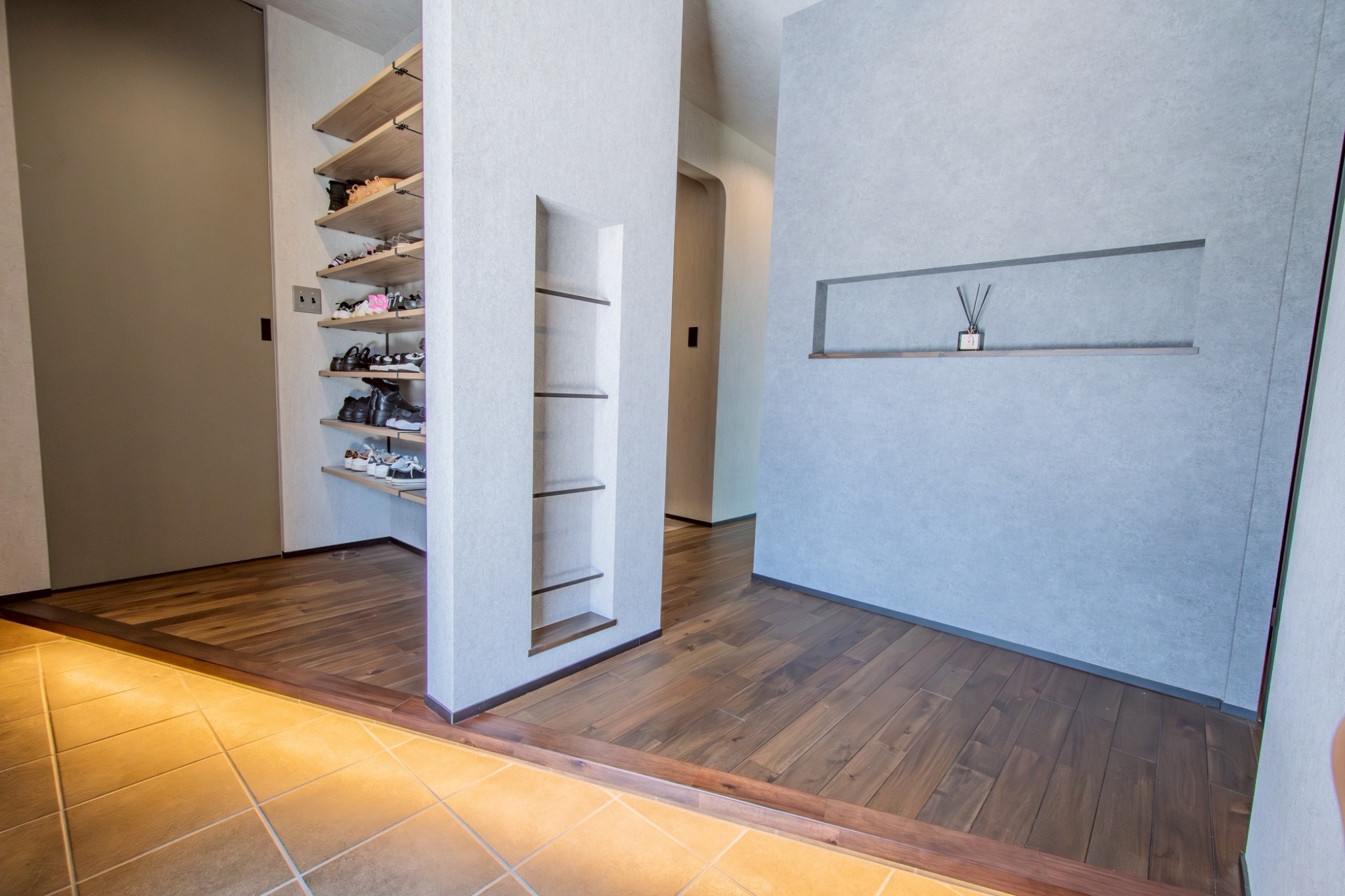 玄関ドアを開けると早速、框のライン照明が素敵なエントランス空間がお出迎え!